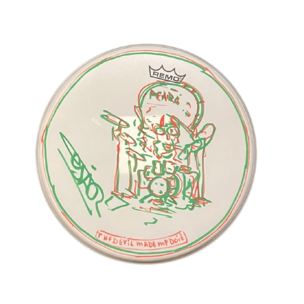 Dit unieke drumvel is beschilderd en gesigneerd door Cesar Zuiderwijk, 50 jaar lang drummer van de Golden Earring. Het is een doorzichtig vel van het merk Remo, Ambassador coated, die een diameter van 37 cm (14,5 inch) heeft.