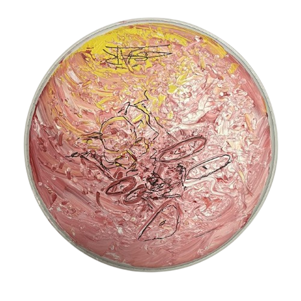 Dit unieke drumvel is beschilderd en gesigneerd door Cesar Zuiderwijk, 50 jaar lang drummer van de Golden Earring. Het is een doorzichtig vel van het merk Pearl, uit de Pro Tone serie, die een diameter van 42 cm (16,5 inch) heeft.
