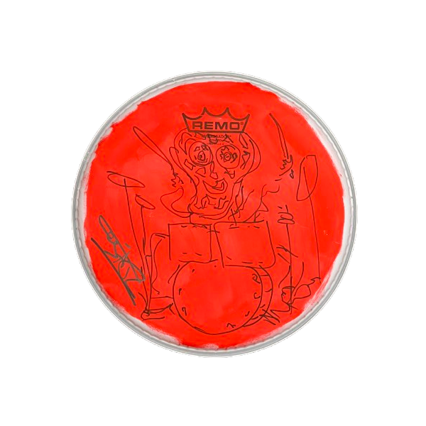Dit drumvel is getekend en gesigneerd door Cesar Zuiderwijk, drummer van de Golden Earring.