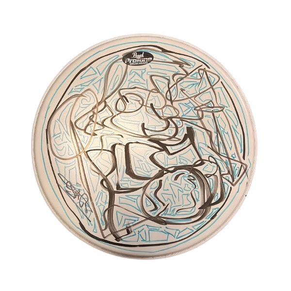 Dit drumvel is getekend en gesigneerd door Cesar Zuiderwijk, drummer van de Golden Earring.